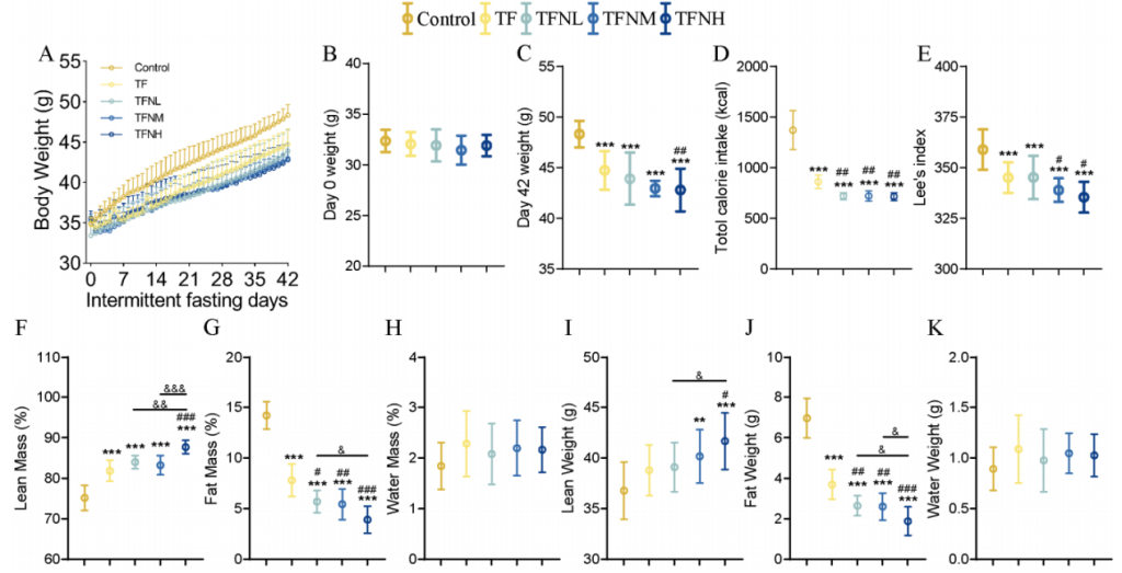 研究人员对自然衰老小鼠进行了为期6周的干预。QMR监测数据(Figure 1I-K)显示:脂肪量 (Fat Mass): 联合干预组(NMN+TRF)的体脂含量相比对照组显著下降。