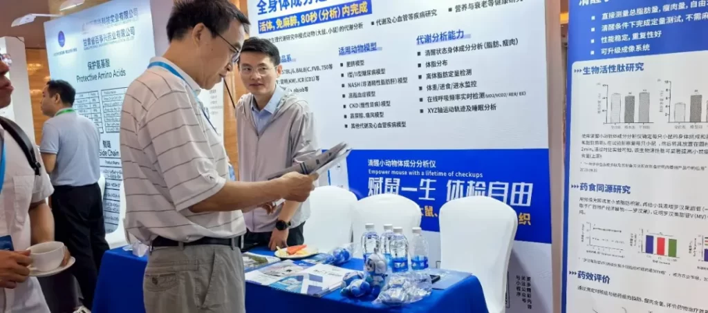 纽迈展台展示的清醒小动物体成分分析技术,能够对活体模式动物进行无创、免麻醉的全身扫描。仅需80秒,即可精准获得脂肪、肌肉、体液等关键成分的定量数据。这项技术正在帮助研究人员在运动生理代谢、营养与衰老等健康研究中,实现对同一实验动物的长期、动态追踪,极大提升了数据可靠性,并充分体现了动物福利。