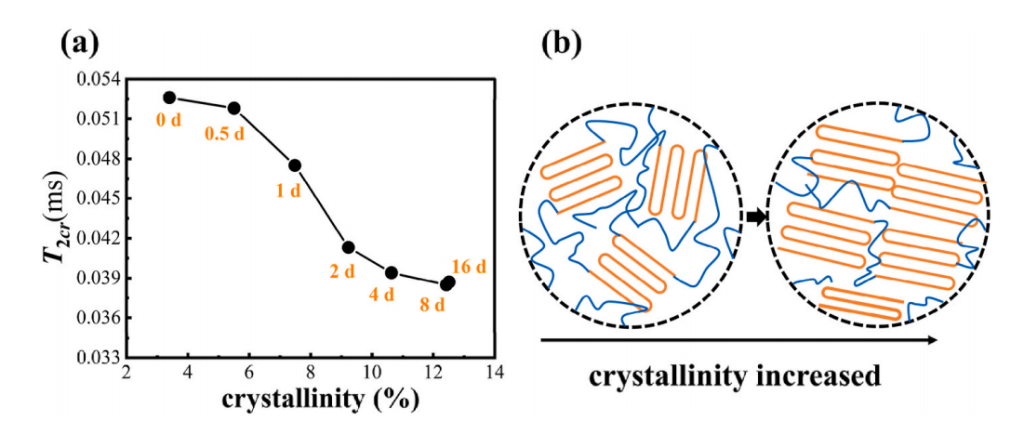 图2(a)  T2cr 与结晶度之间的关系;(b)结晶度增加时链段变化的示意图。