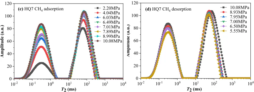 (3) 在2、4、6、6.5、7、8、9和10MPa的压力下向样品室注入CH4,直到煤样品饱和。一旦核磁信号达到稳定状态(通常约为1.5-2小时),就可以认为煤样已经达到了 “表面吸附平衡 “的状态。
