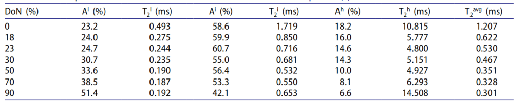 A i呈现先小幅上升(0%-23% DoN)后下降的趋势,在 23% 和 50% DoN 处出现两个拐点,反映了离子聚集体形成与网络链转化的平衡过程;T2i随 DoN 增加先下降(0% DoN 时 1.719 ms→50% DoN 时 0.532 ms)后小幅上升(50%-90% DoN 时 0.532→0.653 ms),说明低 DoN 时网络链运动性受离子聚集体纠缠限制,高 DoN 时部分低运动性短链被离子聚集体捕获,剩余长链运动性略有提升。