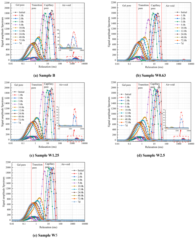 图三为水化过程中T2谱变化,在前5h内,T2谱峰全部左移,毛细血管孔隙和孔隙变化最明显。过渡孔的峰面积不断减小,凝胶孔的峰面积逐渐增大。10 h后,弛豫时间均小于10 ms。凝胶孔和过渡孔的峰面积明显增大,气孔和毛细孔消失。24h后,松弛时间和峰面积趋于稳定并保持不变。