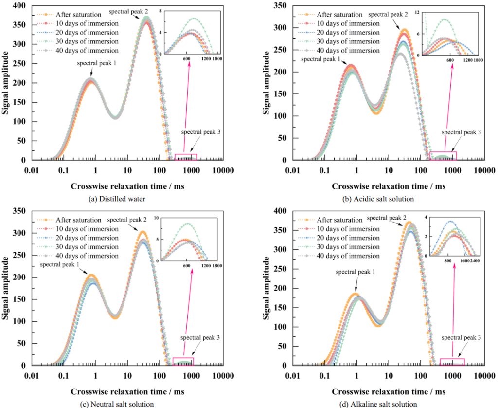 1)谱与孔隙结构的关系:T2谱的面积和变化率与孔隙半径密切相关。根据核磁共振(NMR)原理,弛豫时间与孔隙半径成正比,较长的T2时间对应较大的孔隙,较短的T2时间对应较小的孔隙。酸性盐溶液可能促进孔隙的溶解和扩展,而碱性盐溶液可能促进新矿物沉淀和孔隙填充
