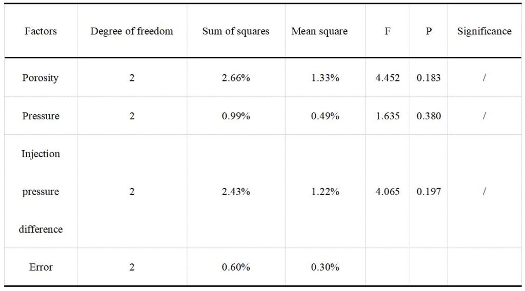 方差分析(ANOVA)与极差分析一起用于评估因子显著性。虽然方差分析的F值(表2)表明孔隙度>注入压差>压力的影响层次,但没有因素具有统计学意义(p>0.05)。极差分析和方差分析之间的差异源于它们不同的方法论基础。范围分析根据影响大小(R值)的大小对因素进行排名,突出显示导致残余水饱和度最大绝对变化的参数,而方差分析通过将方差分量与实验误差进行比较来评估统计显著性(F和p值)。这种差异突显了这两种方法在识别具有实际影响和统计稳健性的影响因素方面的互补性。