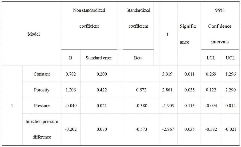 (1)使用SPSS软件建立多元线性回归方程:SW=0.782+1.206φ-0.04P-0.202ΔP。分析表明,注入压差的影响最大,其次是孔隙度,压力的影响最小。模型的可靠性和线性关系的显著性得到了统计证实。