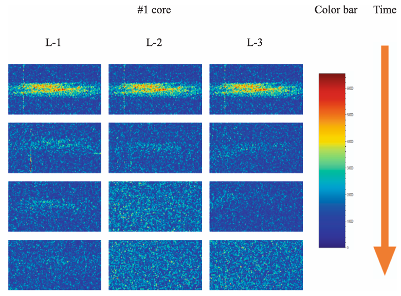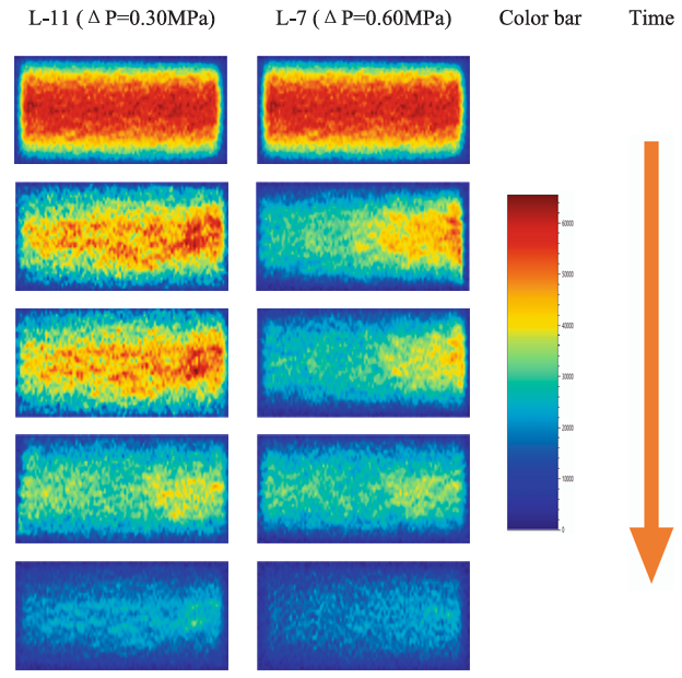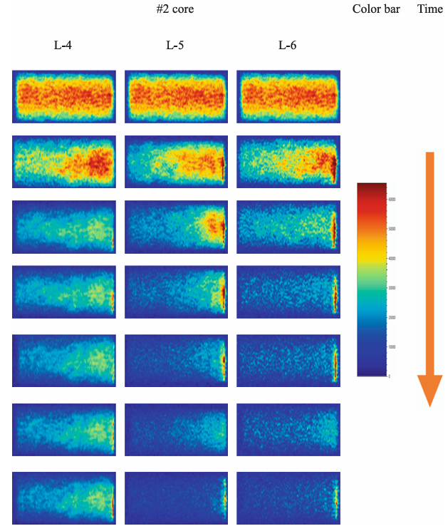 为了分析岩心驱替过程中的平面内水的迁移赋存,MRI可视化了二维水分布(图15-17)。低(蓝色)和高(红色)信号强度分别对应于含水量的降低和升高。MRI图像显示了CO2驱替过程中显著的空间异质性特征(图15-17)。低孔隙度#1岩心最初表现出微弱的MRI信号,在整个CO2驱替过程中逐渐衰减,直到与背景噪声无法区分,这最终证明MRI图像质量主要受孔隙空间中的含水量控制。与之形成鲜明对比的是,#2和#3岩心最初表现出均匀的水分分布,但在注入二氧化碳的过程中逐渐形成了明显的非均匀模式:由毛细管捕获引起的孤立水团和由毛细管末端效应引起的岩心出口积水。MRI图像中观察到的空间异质性对二氧化碳封存的安全性有重大影响。毛细管捕获的水团簇增强了残余相捕获,这可能会产生局部饱和度梯度。因此,确定该水团的分布模式对于定位剩余封存优势区和预测二氧化碳羽流滞留路径至关重要。出口处的毛细管端部效应表明,如果在现场模拟中没有适当考虑,实验室测量可能会高估剩余捕获效率。这些发现强调了在储层模型中考虑孔隙尺度非均质性的必要性,以更准确地预测二氧化碳羽流的长期迁移模式和捕获机制。