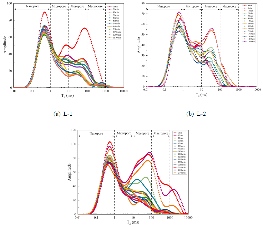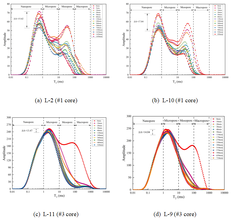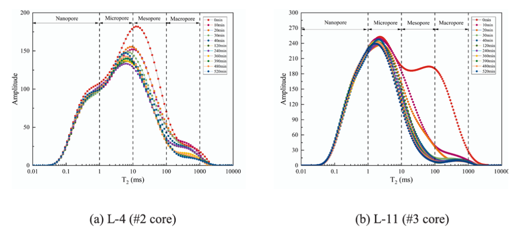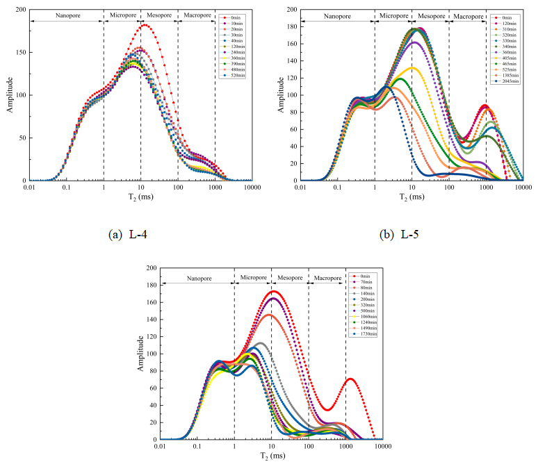 孔隙度是指岩心中孔隙体积占总体积的比例,通常以百分比表示,反映了岩石中可以容纳流体的空间大小。它是决定岩石储层储集能力和流体运移特征的关键参数。为了研究孔隙度对残余水的影响,在保持其他参数不变的情况下进行了补充实验L-11。实验结果如图4所示。图4通过实验L-4和L-11的对比分析,展示了孔隙度与残余水饱和度之间的正相关关系。这种现象源于孔隙尺度的动力学机制:当岩心孔隙度较高时,CO2倾向于在大孔和中孔中形成主要的渗流通道,从而绕过以毛细管力为主的微孔区域,使微孔中的水难以被有效驱替。在低孔隙度条件下,岩心缺乏明显的有利流动路径,对二氧化碳流动的阻力增加,使其能够更均匀地进入微纳尺度孔隙,从而提高微尺度驱替效率,最终导致残余水饱和度降低。孔隙度的增加增强了二氧化碳在大孔/中孔中的优先驱替(图5),使微孔区域(特别是在孔隙度较高的岩心中)排水不足。核磁共振监测显示,10%孔隙度岩心的微孔T2信号持续降低,而15%孔隙度试样的变化很小,这证实了高孔隙度岩心微孔中的水难以有效驱替。