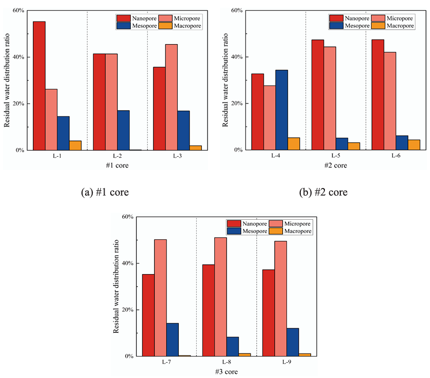 从图14可以看出,在9组正交设计的岩心驱替实验中,残余水主要存在于纳米孔和微孔中,90%以上的残余水出现在纳米孔和微孔(L-8)中。除L-4外,不少于70%的残留水存在于纳米孔和微孔中。从图14可以看出,大孔中残留的水不到5%,这表明绝大多数水最终存在于纳米孔、微孔和中孔中。这表明,在不同的实验条件下,大孔仍然是二氧化碳驱水的主要区域,而纳米孔中的水很容易被二氧化碳气体堵塞和保留。因此,大孔隙比例高的岩心容易发生气窜,进而影响小孔隙中水的驱替。因此,图13和14表明,岩心的孔隙结构对捕获残余水的过程有重大影响。