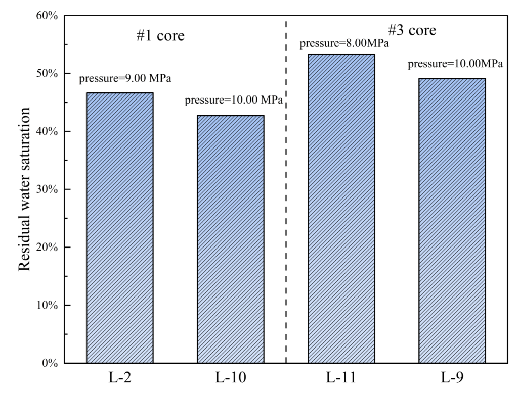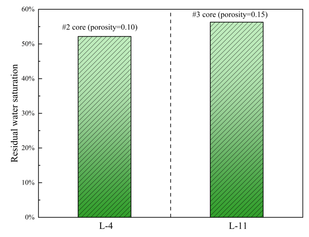 注入压差是指岩心驱替实验中注入压力与背压(压力)之间的差值,是影响CO2流量和驱替效率的关键因素。为了研究注入压差对残余水的影响,在保持其他参数不变的情况下进行了补充实验L-10和L-11。实验结果如图8所示。